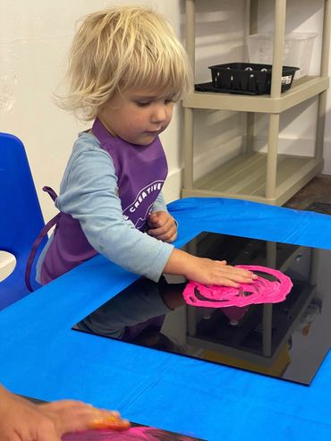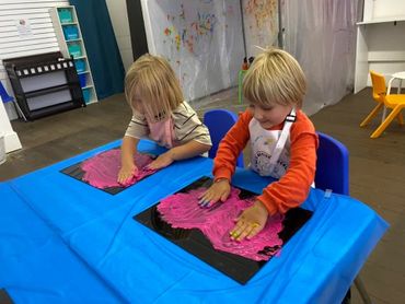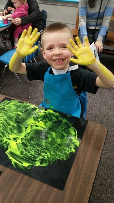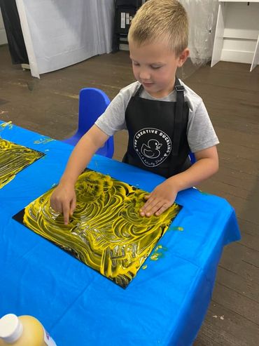 The older kiddos that visit the studio have the option of trying some of the more intricate painting techniques like marbles, elastics, process art, etc. in their choice of tempra (washable) or acrylic paint or another option is bleeding art tissue!